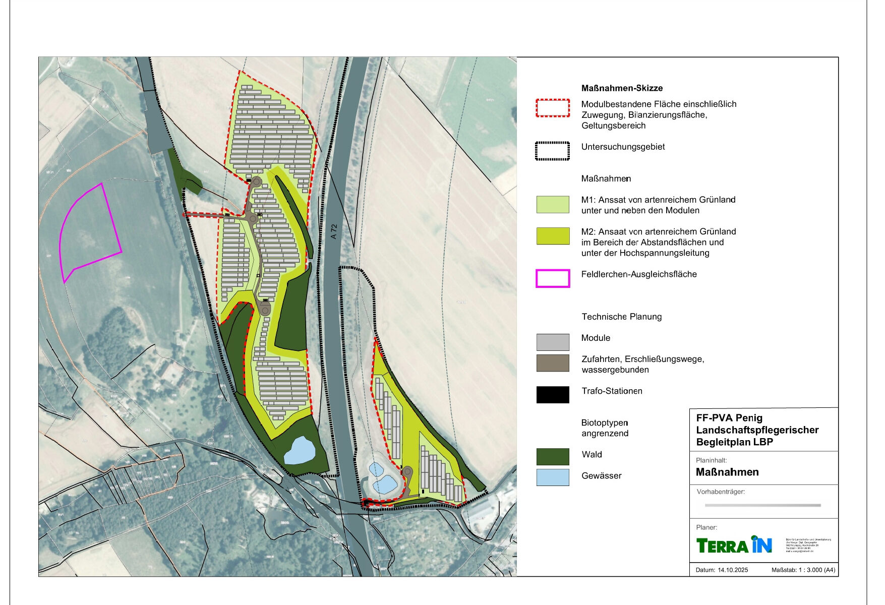 Landschaftspfelgerischer Begleitplan, naturschutzrechtliche Eingriffsbilanzierung (Sächsische Handlungsempfehlung), floristische und faunistische Kartierungen, Artenschutzrechtlicher Fachbeitrag für eine Freiflächen-Photovoltaik Anlage bei Penig. I.A. ASG Köthen. 2024.