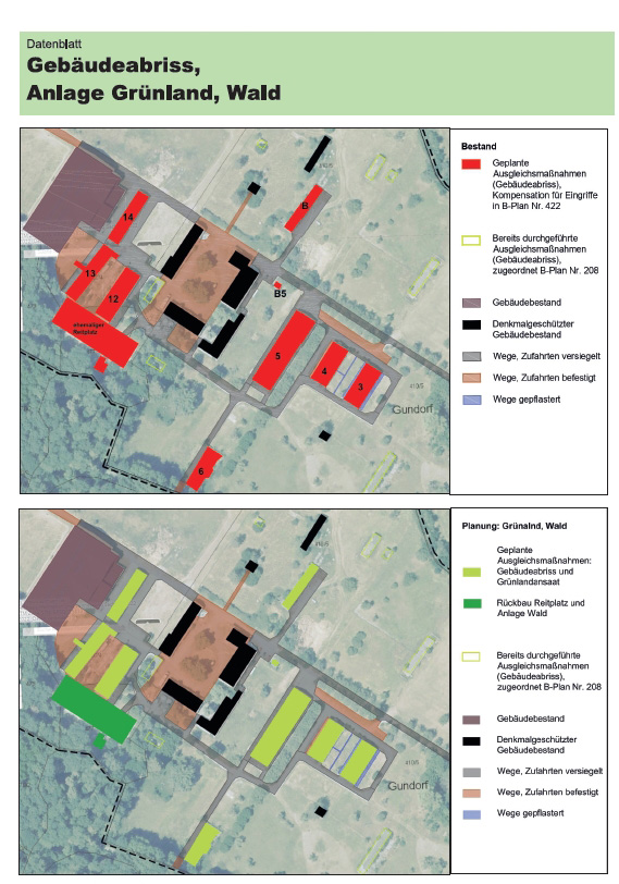 Für das rund 50 ha große geplante Gewerbegebiet werden 15 externe Ausgleichsmaßnahmen (gesamt rund 15 ha) geprüft und mit Hilfe des Leipziger Bewertungsmodells (Leipziger Bewertungsmodell für die Bilanzierung von Eingriffen in Natur und Landschaft sowie deren Ausgleich) bewertet und in Datenblättern dokumentiert. I.A. Stadt Leipzig. 2011.